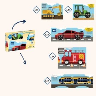 Met de Coblo Transport Toppers veranderen kinderen hun Coblo bouwwerken in verschillende voertuigen. Kinderen klikken de toppers op de Coblo bouwstenen en door de juiste kaartjes bij elkaar te zoeken, als een soort van puzzel, veranderen ze de ‘gewone’ Coblo stenen in de mooiste voertuigen zoals een race-auto, tractor of brandweerwagen.