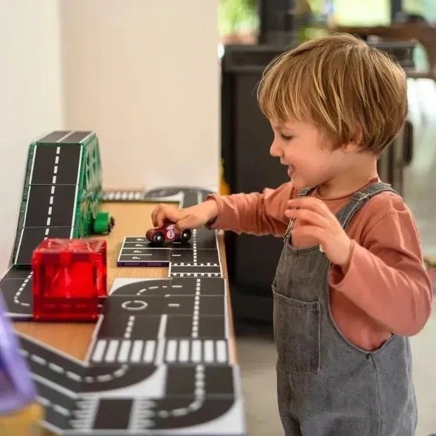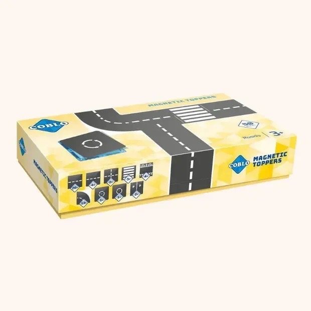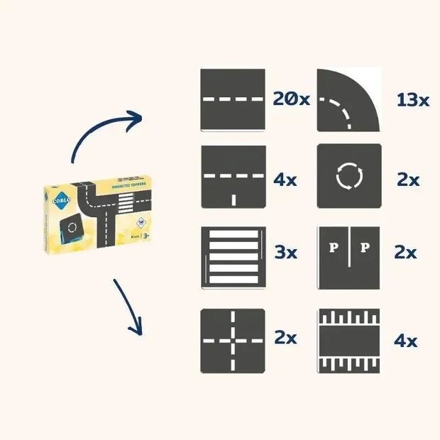 Spelen met Coblo wordt met deze toppers nog leuker en veelzijdiger! Met deze magneet wegen veranderen kinderen hun Coblo set in een toffe autoweg. De magneet toppers hebben het formaat van een Coblo steen en door de zwarte laag aan de onderkant (met magneetdeeltjes) klikken kinderen de magneet toppers makkelijk op de Coblo stenen; deze passen precies. Let op: de magnetische toppers zijn van zichzelf niet magnetisch waardoor je de Coblo stenen nodig hebt, om de toppers bijvoorbeeld op een white board of koelkast te plakken.