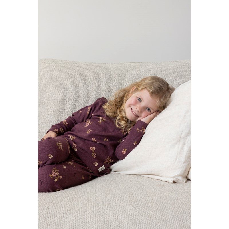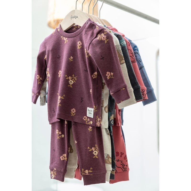 De pyjama heeft lange mouwen, tricot boordjes, een ronde hals en is van 96% biologisch katoen en 4% elastaan.