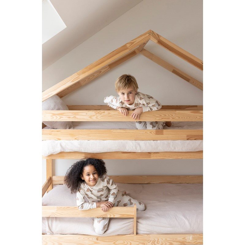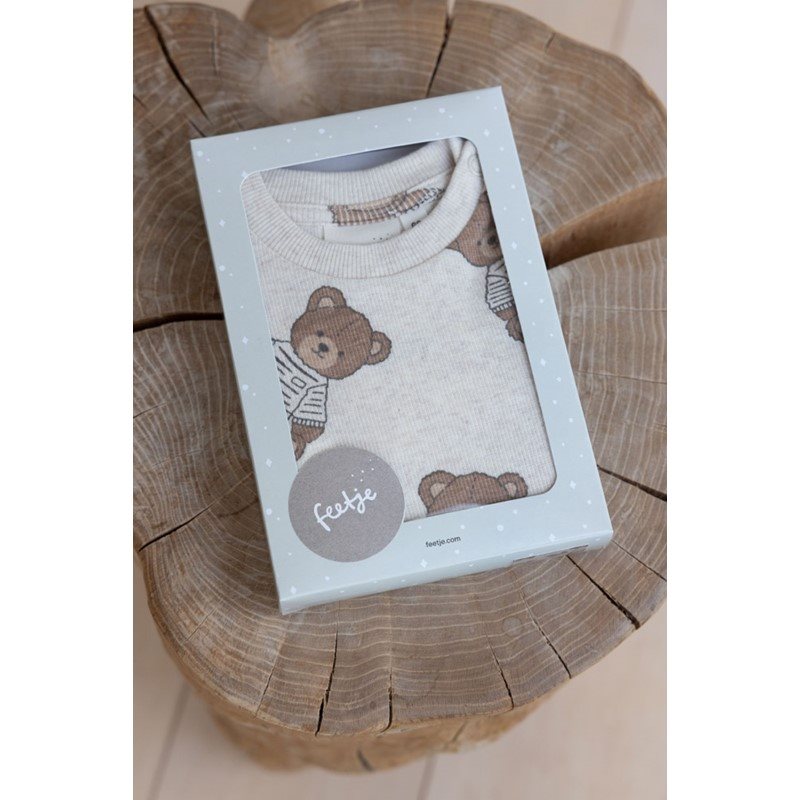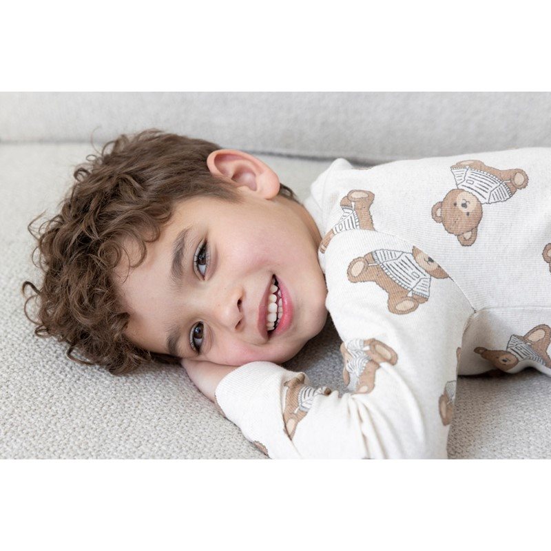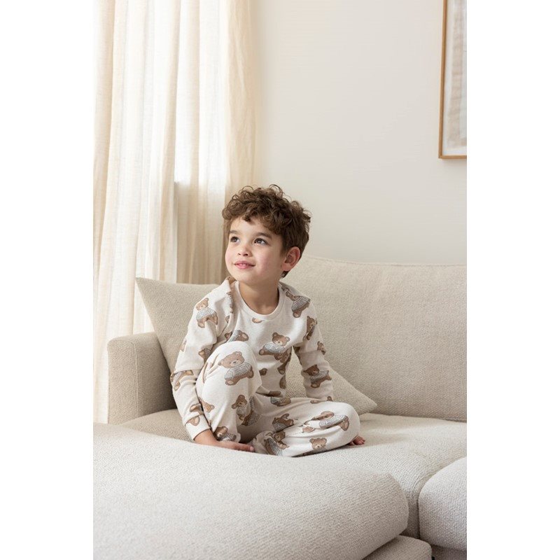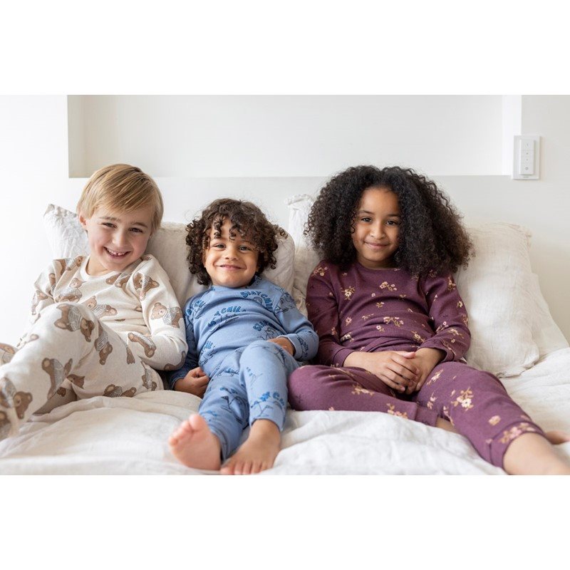 De pyjama heeft lange mouwen, tricot boordjes, een ronde hals en is van 96% biologisch katoen en 4% elastaan.