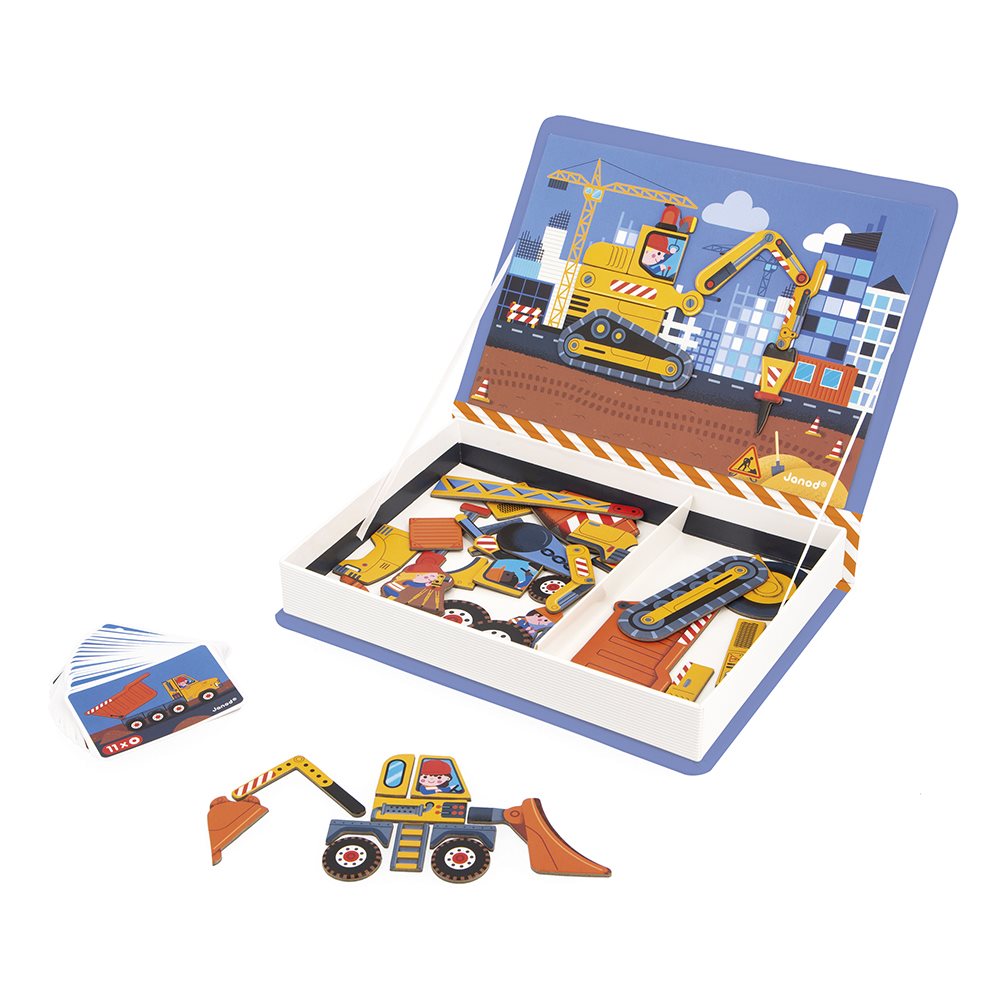 De werkzaamheden zijn begonnen! De stad breidt zich uit. Samen met het bouwteam nieuwe gebouwen maken! Magnetisch spel bestaande uit 50 magneten en 18 kaarten. Het doel van het spel is om de voertuigen op de magnetische achtergrond na te maken volgens de voorbeelden op de kaarten. Zo kan uw kind de bekende bouwkraan, maar tevens een bulldozer, een drilboor of een graafmachine namaken! Naast het educatieve aspect, maakt Magnetibook-constructie het mogelijk om de magneten te combineren en zo de creativiteit van uw kind de vrije loop te laten om nieuwe voertuigen te creëren. Educatief magnetisch spel van FSCTM-karton voor kinderen vanaf 3 jaar.