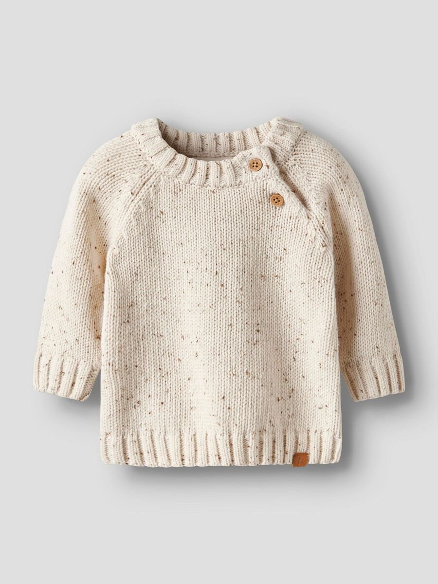 Deze gebreide trui is van biologisch katoen en heeft een ronde hals met knoopsluiting.