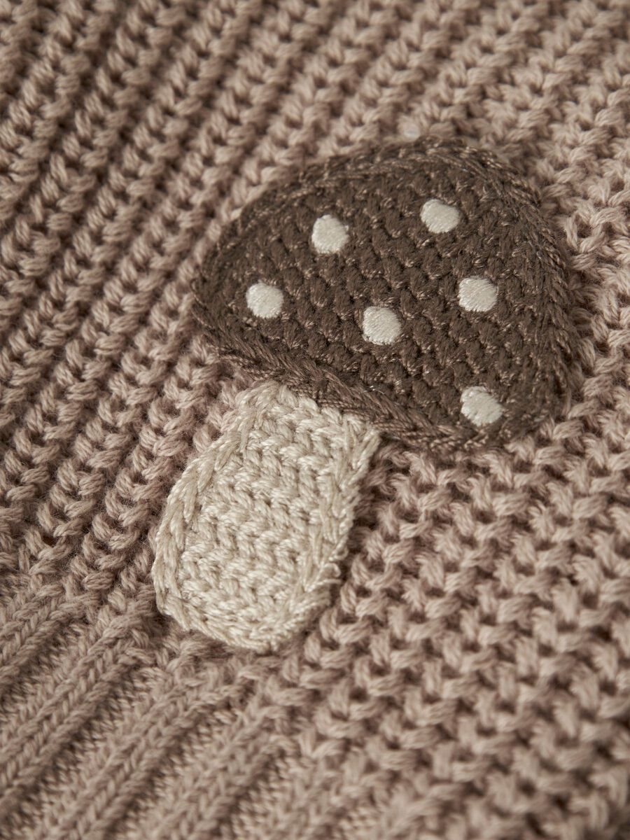 Gebreid vest met op de voorkant 2 paddestoelen.