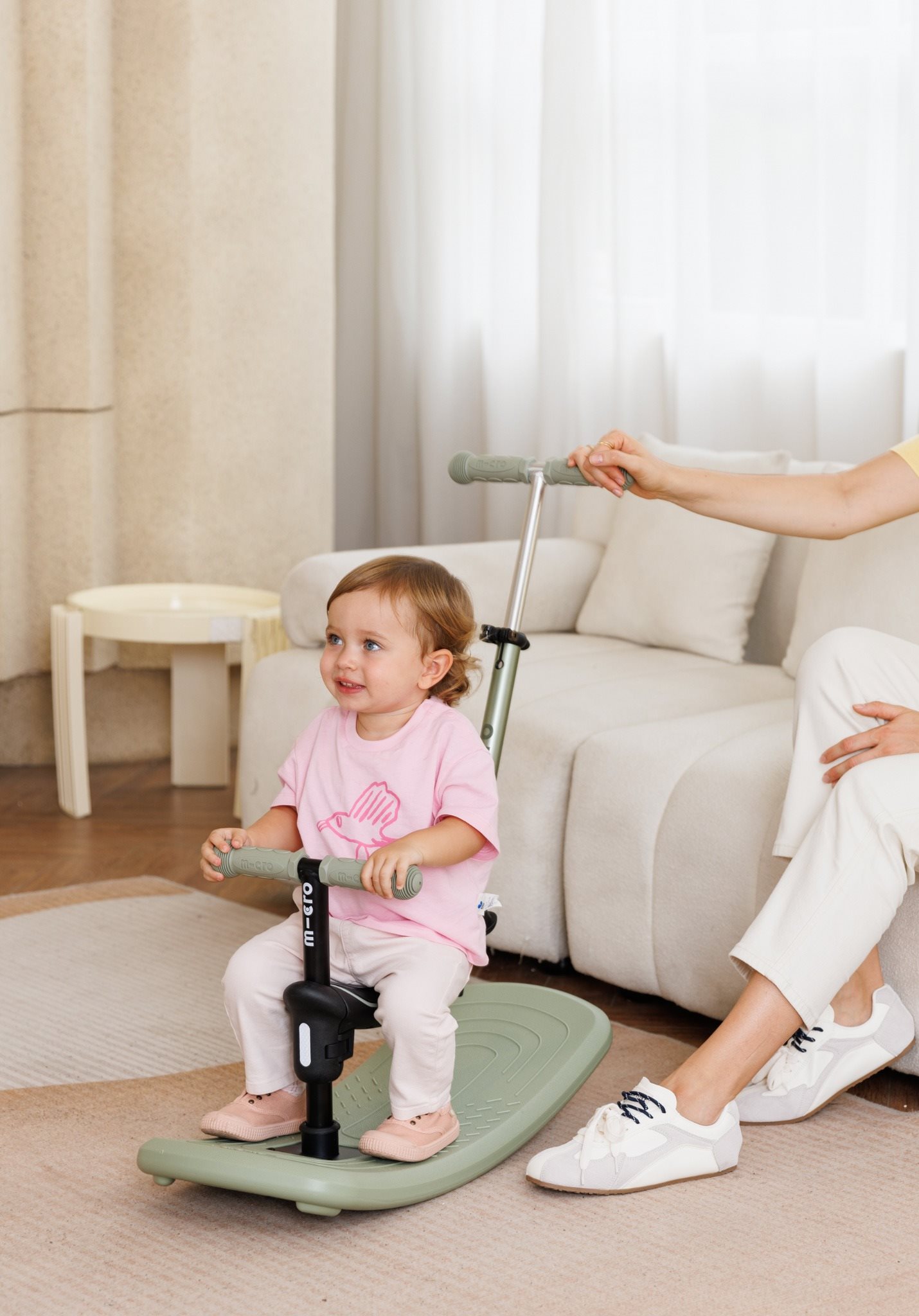 Ride-on – step met zitje en duwstang. Perfect voor de eerste ritjes buiten. De duwstang maakt sturen en voortbewegen eenvoudig, terwijl je kind veilig en comfortabel meereist.