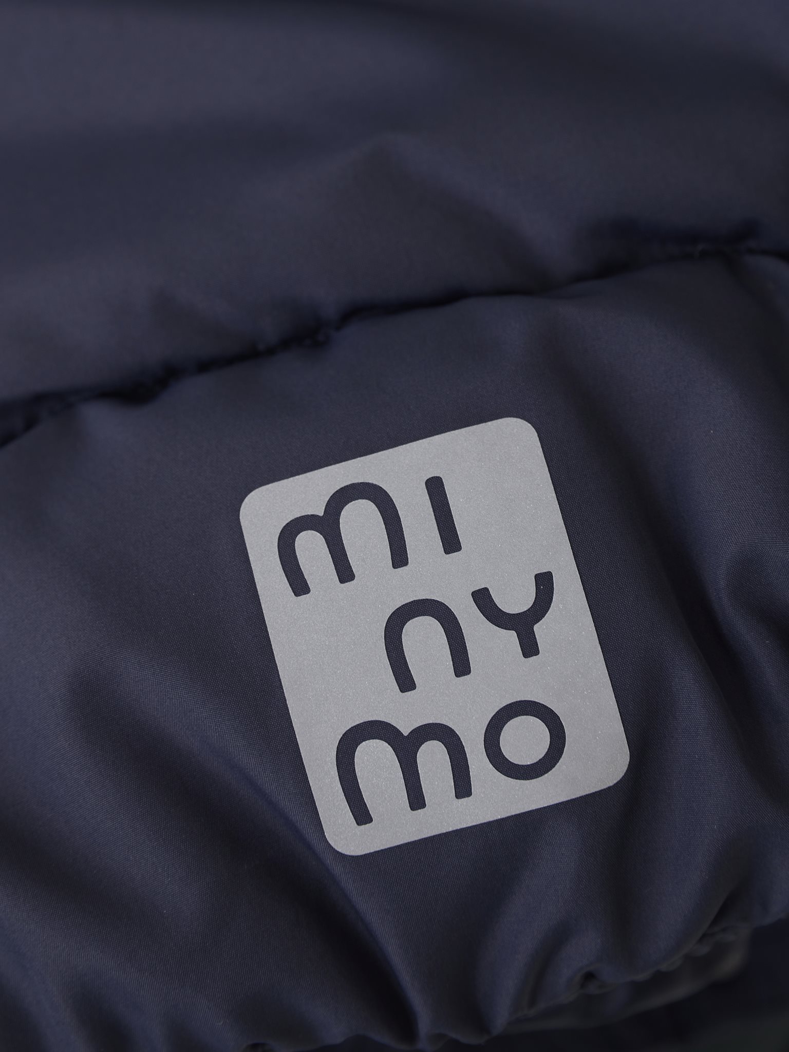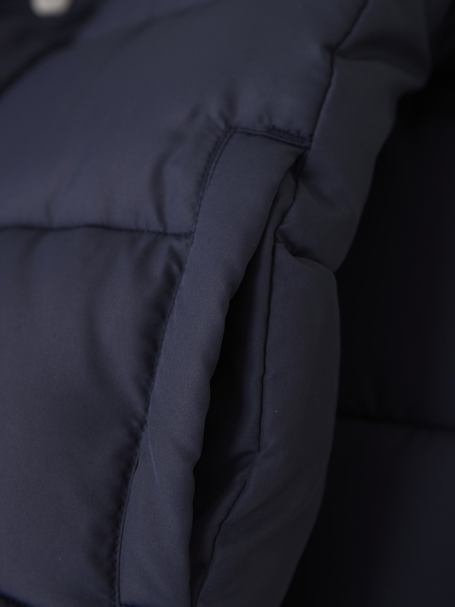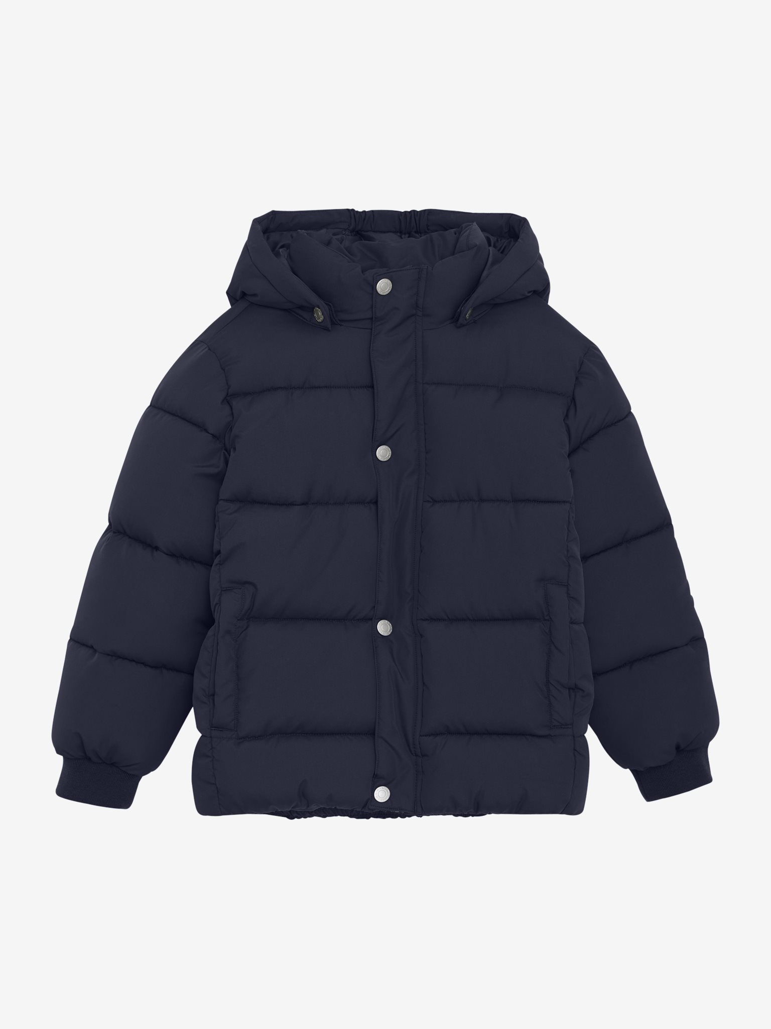 Gewatteerde donkerblauwe jas met een afneembare capuchon.