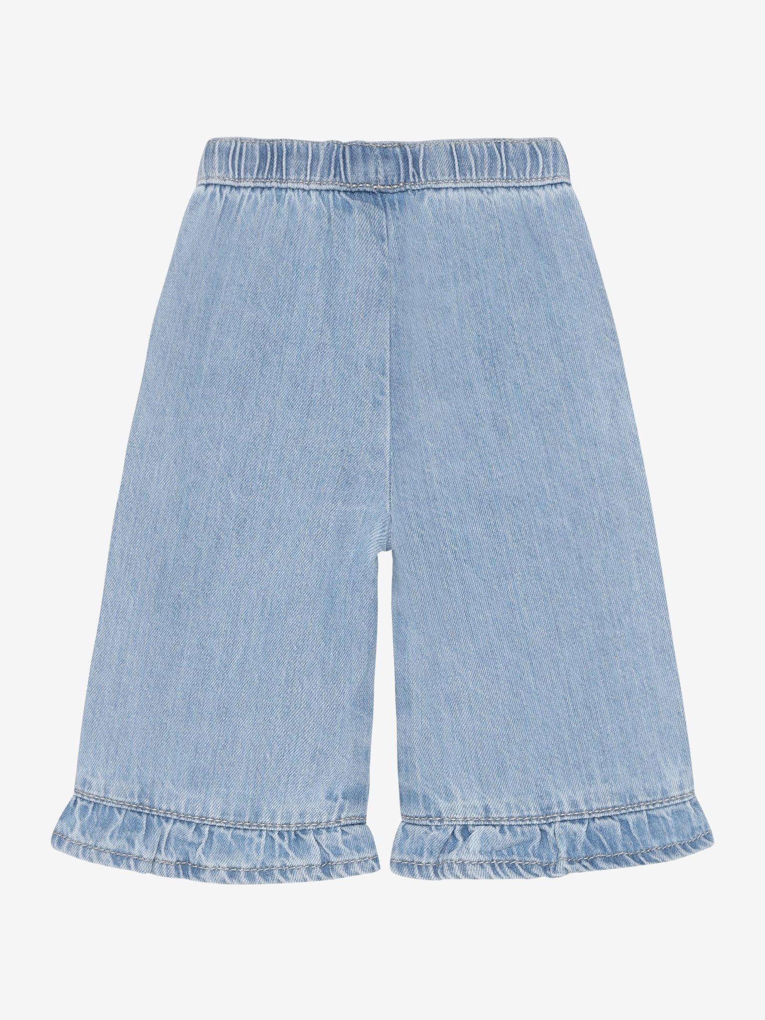 Een ruchesdetail langs de zoom voegt een zacht, vrouwelijk accent toe en de lichtblauwe denim past bij vrijwel alles. Zonder sluiting is de broek gemakkelijk aan te trekken.