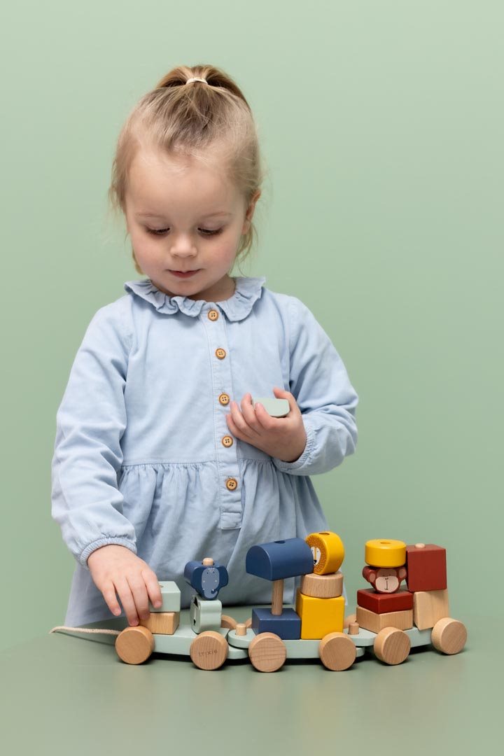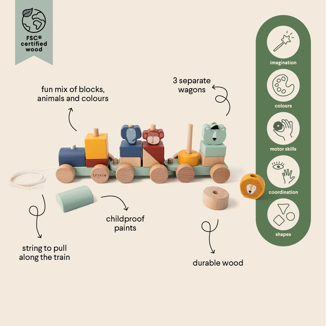 Spring op de trein met onze dierenvrienden! Met alle verschillende blokken in verschillende kleuren, kun je je eigen wagons maken. Gebruik het touwtje aan de voorkant om je trein mee te trekken op de leukste avonturen! De trein en al zijn elementen zijn gemaakt van 100% FSC ® gecertificeerd hout. Alle verven zijn op waterbasis en veilig voor baby’s.