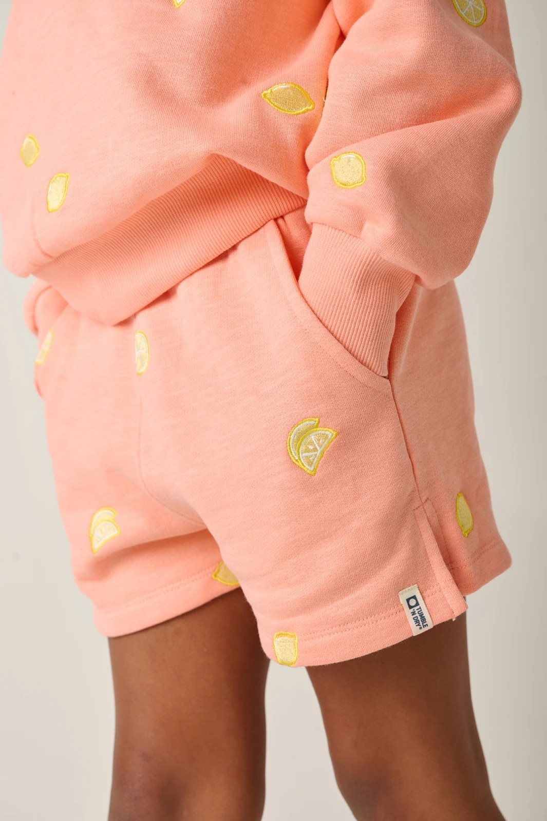 eze meisjes short in pasteloranje met geborduurde citroenen is een zomerse must-have. De short is gemaakt van biologisch katoen en heeft een comfortabele elastische tailleband. Praktische steekzakken maken de short functioneel, terwijl het subtiele label aan de zijkant een stijlvolle touch toevoegt. Het model is 125 centimeter lang en draagt maat 128.