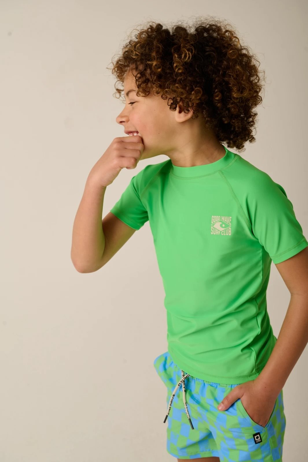 Dit fris groene zwemshirt met korte mouwen combineert stijl en functionaliteit. De ronde hals en comfortabele pasvorm zorgen ervoor dat kinderen vrij kunnen bewegen tijdens het spelen in de zon. Het minimalistische printdetail op de borst toont een zomers tafereel met een golf, perfect voor stranddagen. Het shirt is gemaakt van een soepele stof met 85% gerecycled polyester en 15% elastaan, wat zorgt voor een comfortabele stretch. Het model is 135 centimeter lang en draagt maat 128.